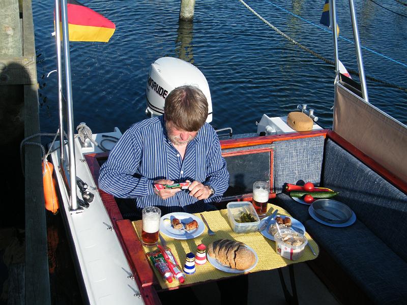 Der Treibstoff (Benzin)an Bord reicht für ca. 200 – 350 km Fahrstrecke, Trinkwasser für 3 Tage und Proviant für ca.5-6 Tage. Speisen werden mit einem schiffstauglichen Spirituskocher zubereitet. Im Notfall können wir kleine Mengen Trinkwasser an Bord mit einer Filteranlage selbst bereiten. Solange die Maschine mit ihrem Generator(max.75 Amp / 1100 Watt Ausgangsleistung) läuft und die Sonne(Solarpaneel max. 80 W) scheint, haben wir genug elektrische Energie in unseren Lithium-Bord-Akkus mit einer Kapazität von 125 Ah, aufgeteilt auf zwei unabhängig zuschaltbare Akkus mit 20 Ah und 105 Ah. Früher hatten wir einen Blei-Akku mit 55Ah, jetzt sind wir mit mehr als doppelter Kapazität um 50% leichter. Der umbau hat sich voll gelohnt.