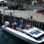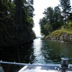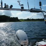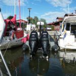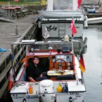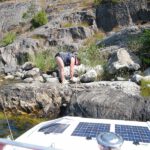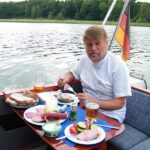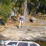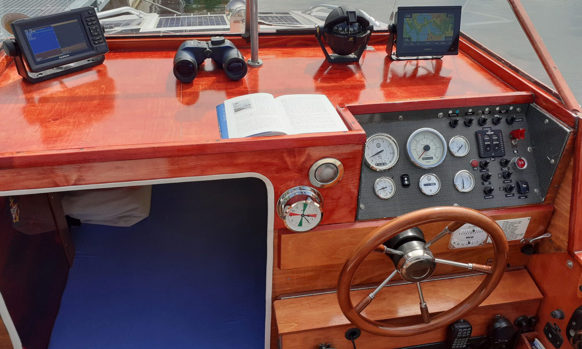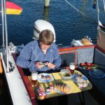 Der Treibstoff (Benzin)an Bord reicht für ca. 200 – 350 km Fahrstrecke, Trinkwasser für 3 Tage und Proviant für ca.5-6 Tage. Speisen werden mit einem schiffstauglichen Spirituskocher zubereitet. Im Notfall können wir kleine Mengen Trinkwasser an Bord mit einer Filteranlage selbst bereiten. Solange die Maschine mit ihrem Generator(max.75 Amp / 1100 Watt Ausgangsleistung) läuft und die Sonne(Solarpaneel max. 80 W) scheint, haben wir genug elektrische Energie in unseren Lithium-Bord-Akkus mit einer Kapazität von 125 Ah, aufgeteilt auf zwei unabhängig zuschaltbare Akkus mit 20 Ah und 105 Ah. Früher hatten wir einen Blei-Akku mit 55Ah, jetzt sind wir mit mehr als doppelter Kapazität um 50% leichter. Der umbau hat sich voll gelohnt.
